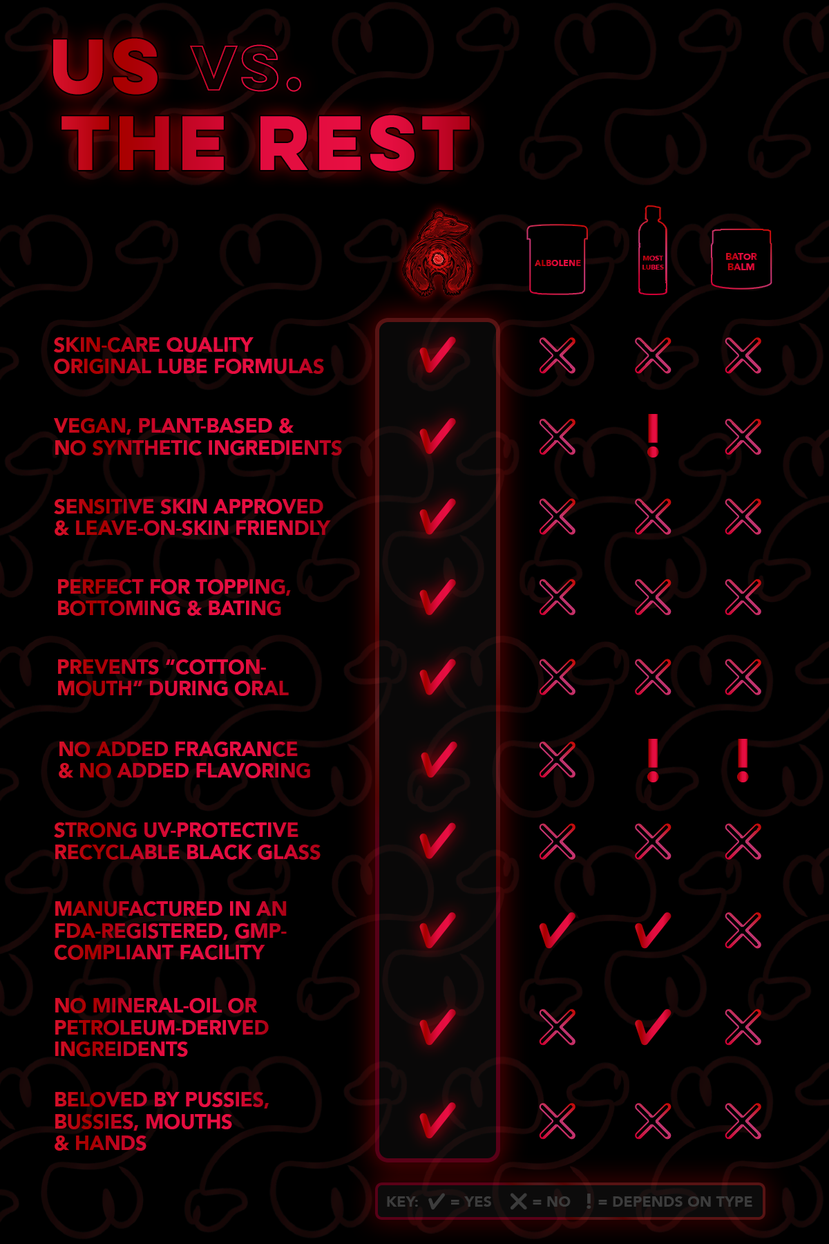 Bearback isn’t just unique — we’re better. Our comparison chart says it all; we check the boxes you didn’t even know other brands missed! Our lubes are crafted with original formulas in a state-of-the-art, certified lab, unlike many others that simply rebrand existing products or are made in uncertified facilities. Just like you, our products are truly one-of-a-kind!