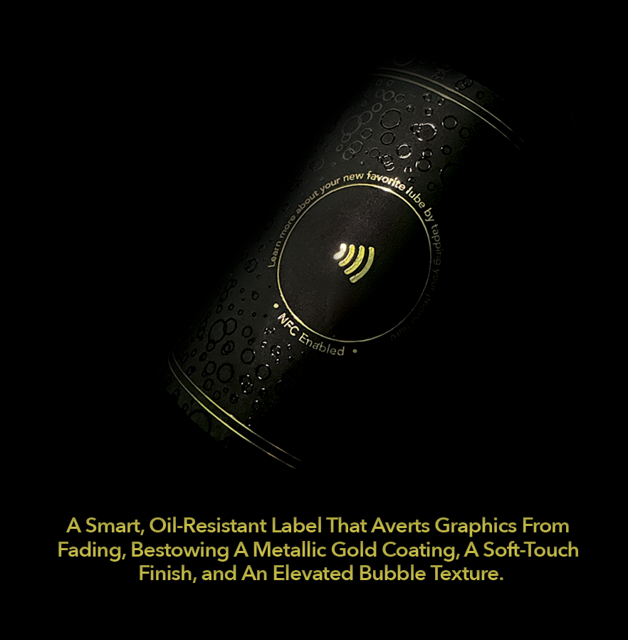 The label is a masterpiece in itself, designed with multiple special effects. We spared no expense on the finishing touches. The label is oil-proof, ensuring that the art will never fade from it. It's adorned with a golden trim and a soft-touch feel. Lastly, the sleek bubble texture is raised, igniting the thrill that your new favorite lube provides from the first touch to the final big bang. 💦